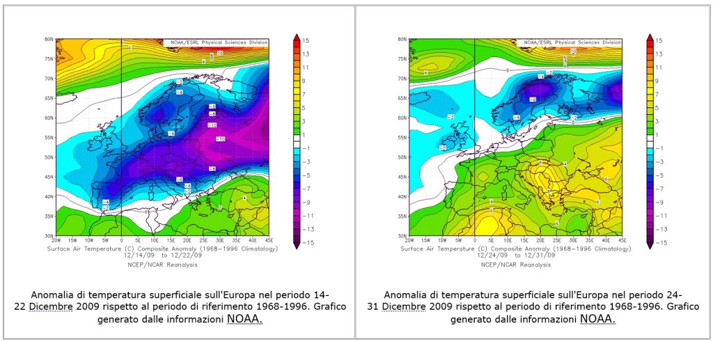 Si noti come la recente anomalia fredda invernale sull’Europa sia stata causata principalmente dall’ondata di freddo nel periodo 18-24 dicembre, ma sia anche stata attenuata dalla successiva ondata di caldo nel periodo 25-31 dicembre, che ha interessato tutta l’Europa centromeridionale, provocando anomalie di oltre 6°C tra Serbia e Bulgaria (in Italia tra +3°C e +4°C), e le latitudini settentrionali con anomalie di oltre +10°C (nello stesso periodo l’irruzione fredda si è ritirata più a nord interessando particolarmente Scandinavia e Russia con anomalie fino a -8°C), a riprova del fatto che il tempo è rapidamente mutevole d’inverno e si possono avere sbalzi termici di diversi gradi in poco tempo.