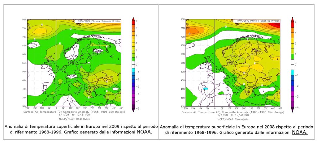Abbiamo ora gli elementi utili per allargare l’analisi all’intero anno 2009, sempre relativamente all’Europa. Si può subito notare come, complessivamente, nonostante le ondate di freddo ricorrenti sia nei primi due mesi sia a dicembre, l’anno possa considerarsi complessivamente più caldo della norma sull’intera Europa, con le anomalie maggiori sul Mar Nero settentrionale e zone costiere adiacenti (+2°C) ed alle latitudini superiori a 70°N (fino a +5°C). L’Italia mostra un’anomalia positiva compresa tra 1°C e 1.5°C. Nel 2008, l’Italia aveva registrato all’incirca un’anomalia dello stesso ordine di grandezza, mentre a livello europeo la parte sudoccidentale era risultata nella media, e quella centroorientale più calda della media, fino a oltre 2°C. Si noti come, comunque, la zona a latitudini superiori a 70°N mostri sempre anomalie vistosamente positive, che nel 2009 sono risultate inferiori al 2008.