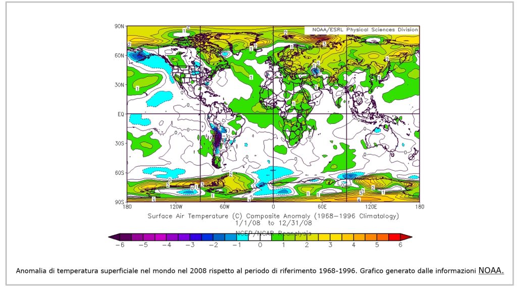 Anomalia di temperatura superficiale nel mondo nel 2008 rispetto al periodo di riferimento 1968-1996. Grafico generato dalle informazioni NOOA