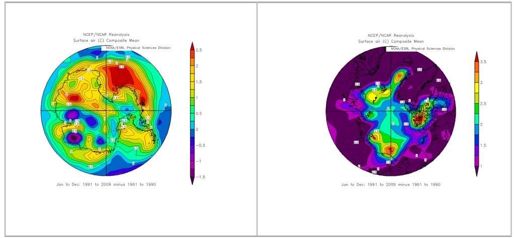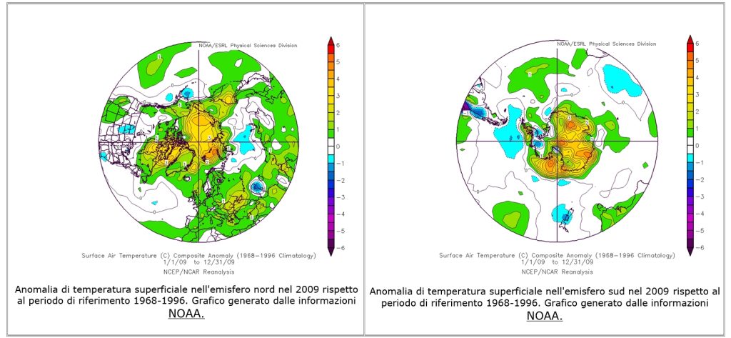 Anomalie di temperatura superficiale nell’emisfero sud e nord relative al periodo 1991-2009 rispetto al periodo di riferimento 1961-1990: si noti che i colori delle scale dei due grafici non sono corrispondenti. Grafico generato dalle informazioni NOOA