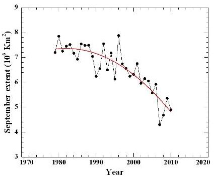 Il fit lineare (non mostrato) fornisce un trend negativo di ottantamila chilometri quadrati l’anno, cioé circa il 12% per decennio rispetto alla media su tutto il periodo. Ma l’analisi dei residui mostra l’inadeguatezza del fit lineare, e che un polinomio del secondo ordine è più appropriato; quest’ultimo è mostrato in figura in rosso. Possiamo quindi dire che, in relazione al periodo 1979-2010, siamo in presenza di un trend negativo in accelerazione.