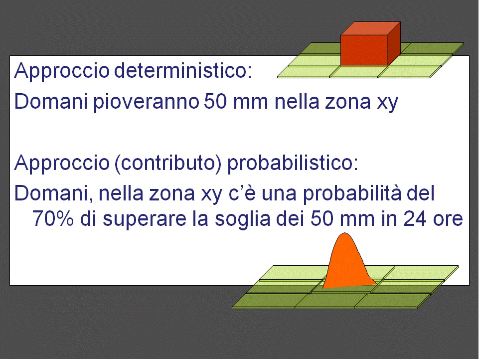 Figura 1. A sinistra, i principali motivi d’incertezza nella previsione meteo. A destra, esempi di previsione deterministica e probabilistica.