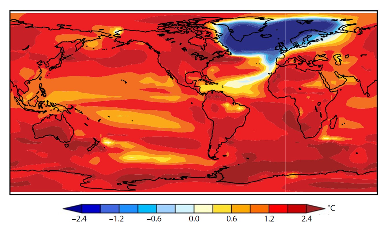 FIGURA 15. Variazione media annuale della temperatura dell’aria in prossimità della superficie, derivante dal raddoppio della CO2 e dall’interruzione dell’AMOC. Mentre la Terra diventa molto più calda, la regione dell’Atlantico settentrionale diventa più fredda. In inverno il raffreddamento è ancora maggiore. Da Liu et al. (2017). > Figura ad alta risoluzione