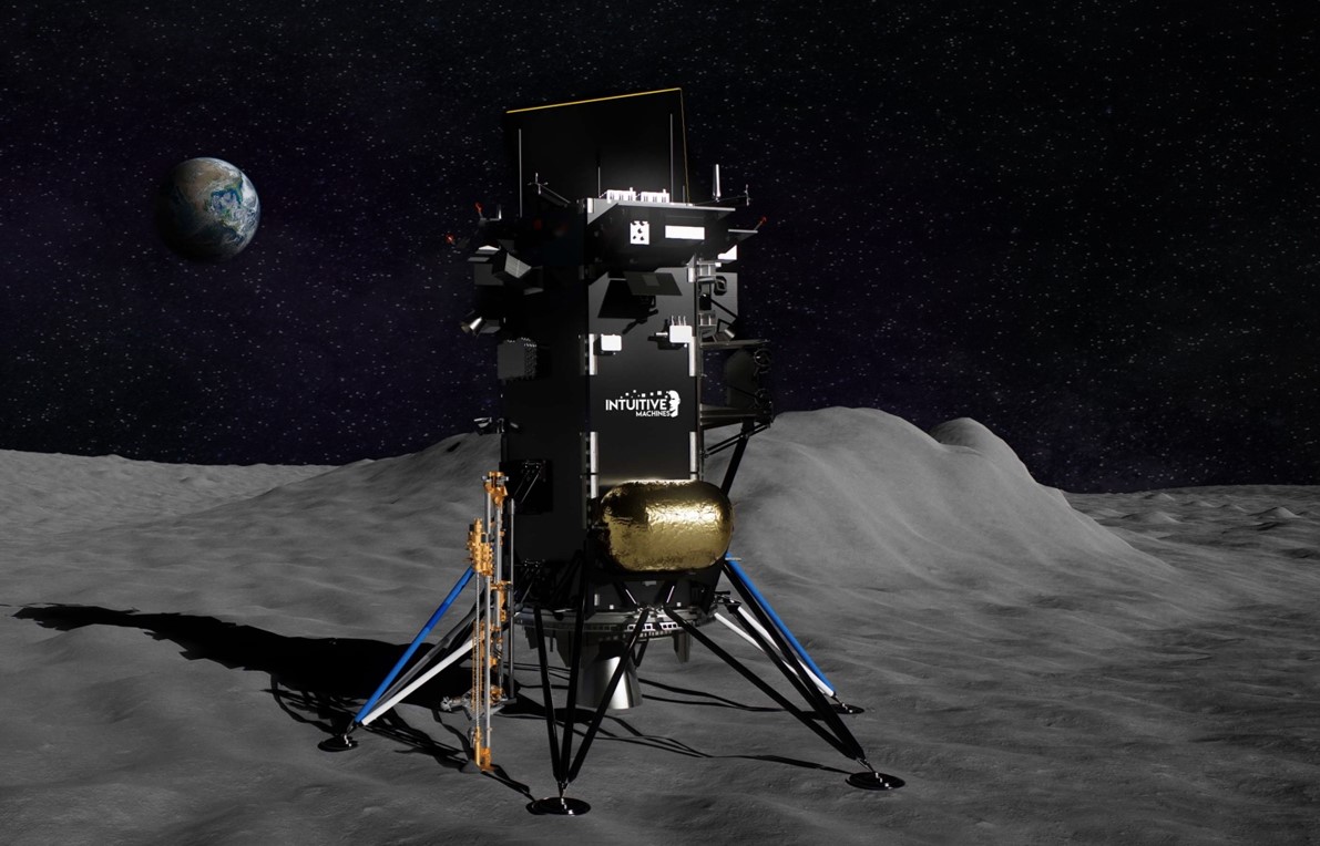 Figura 4: Illustrazione del lander di Intuitive Machines (IM2) della missione PRIME-1 della NASA con il perforatore TRIDENT (in giallo) sul fianco sinistro del veicolo spaziale sulla superficie della Luna.