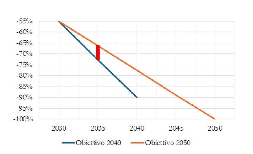 - 2030-2050. ’UE si è già impegnata a raggiungere la neutralità climatica al 2050 (Strategia a lungo termine, comunicato all’UNFCCC nel marzo del 2020). Se si parte da -55% al 2030 e si vuole, raggiungere -100% al 2050, l’obiettivo al 2035 in una traiettoria lineare è -66,25%.