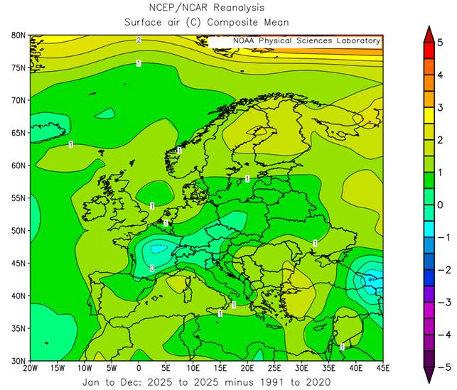 Figura 3 – Anomalie di temperatura superficiale per il 2025 rispetto al trentennio 1991-2020 relativamente all’area europea. Fonte dei dati: NOAA/NCEP. Credit: NOAA/ESRL Physical Sciences Laboratory, Boulder Colorado.