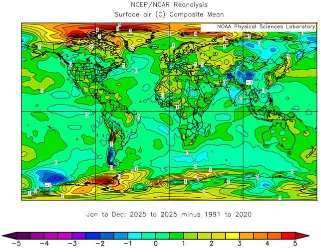 Figura 2 – Anomalie di temperatura superficiale nel 2025 rispetto al trentennio 1991-2020. Fonte dei dati: NOAA/NCEP. Credit: NOAA/ESRL Physical Sciences Laboratory, Boulder Colorado.