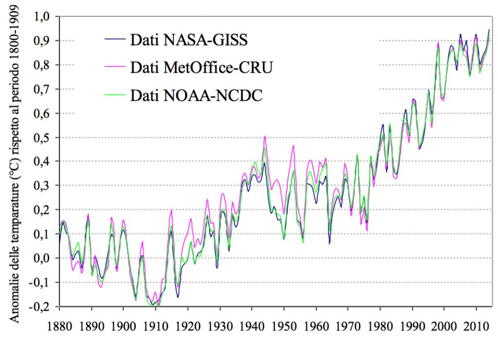 Non è così per la temperatura, influenzata da una variabilità interannuale di gran lunga superiore al trend. La variabilità è dovuta principalmente al fenomeno El Nino (ENSO), alle piccole variazioni della radiazione solare e alle eruzioni vulcaniche. Il trend dalle emissioni di gas serra dalla attività umane. Il 2014 si è chiuso con il record storico delle temperature globali, quattro anni dopo il precedente nel 2010, a sua volta cinque anni prima del precedente. Negli ultimi 40 anni si sono avuti nove record, in media uno ogni circa quattro anni e mezzo, e solo due volte è stato battuto in due anni consecutivi ('80-'81 e '97-'98). (altro…)